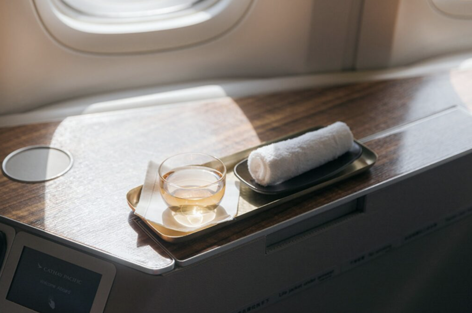 Photo via Cathay Pacific. A welcome reception tray for a first-class passenger complete with a custom JING Tea.